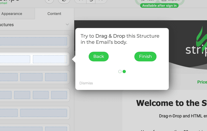 The next step in Stripo’s onboarding is to show you how the product works. It does this by guiding you through an interactive tour.