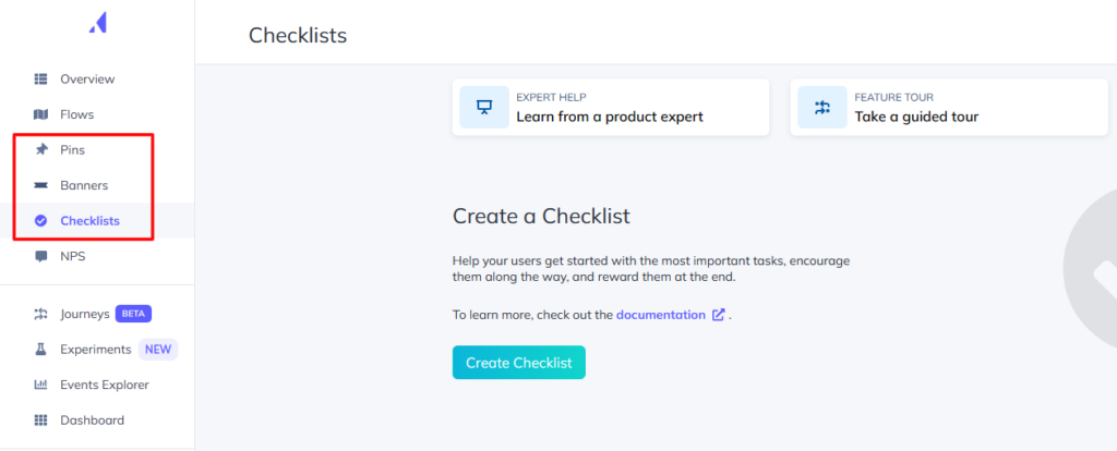 • Checklists: Checklists let you create contextual in-app walkthroughs that familiarize users with different product features. Combining them with other UI patterns like modals, hotspots, and tooltips can help enhance self-service support.