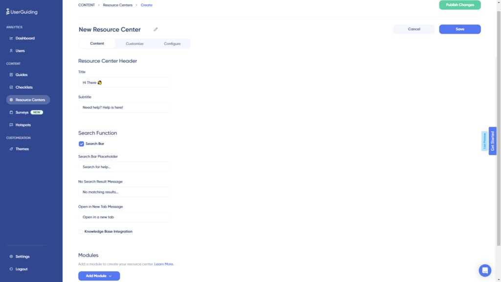 • Resource Center: The most suitable UserGuiding feature for self-service support is the resource center. Resource centers created with UserGuiding are also equipped with a search function to help users find the resources that they need.
