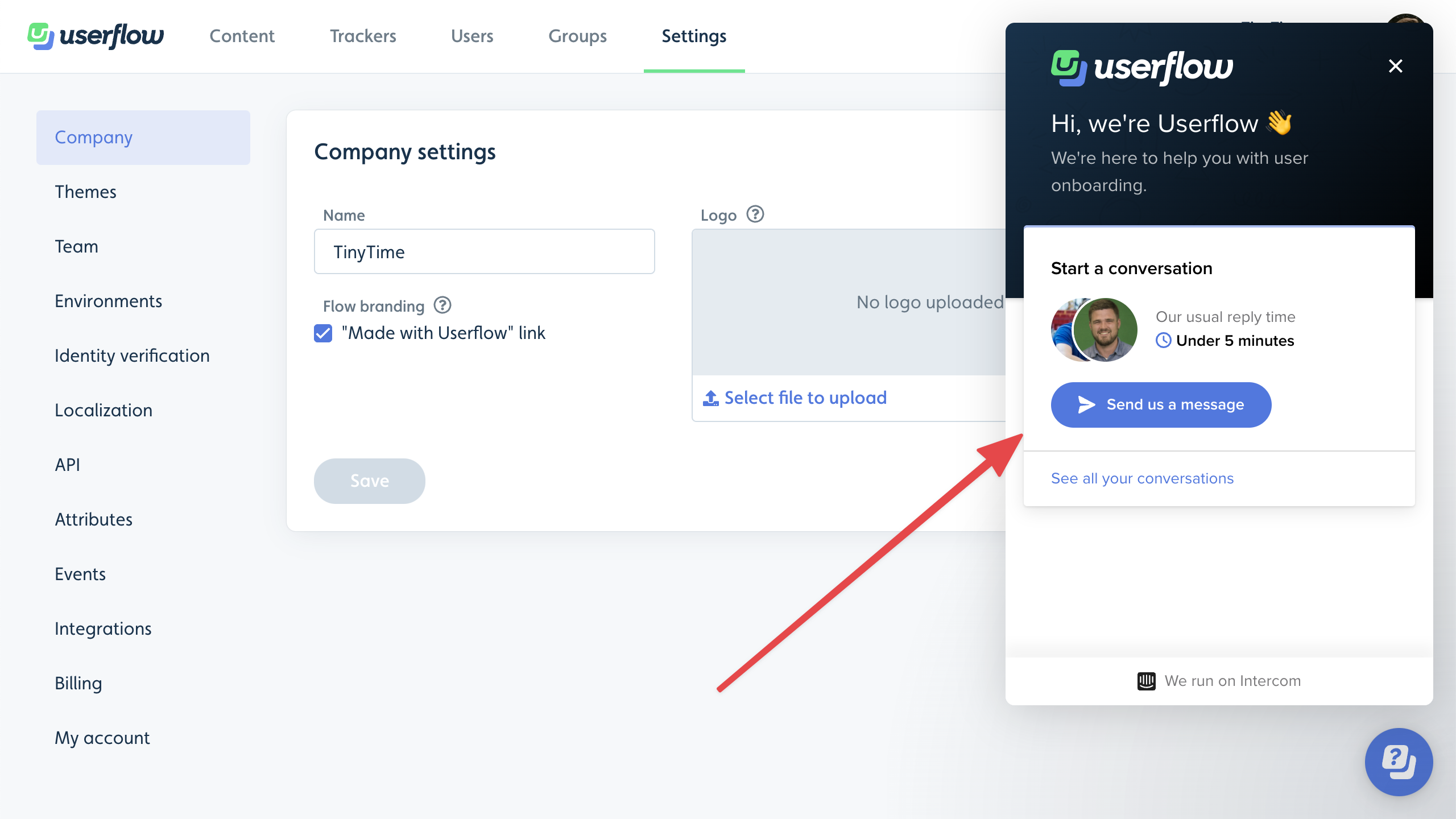 • Support: If your company favors live chat support over AI chatbots, then Userflow might not be the best choice. Userflow does have live chat integrations with tools like Intercom, Zendesk, and Freshchat, but it doesn’t have any native live chat capabilities.