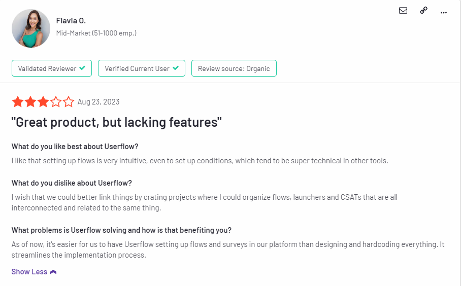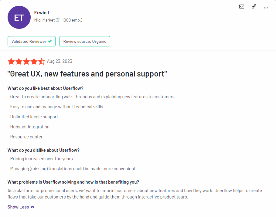 The general consensus from Userflow’s customers seems to be that the user experience and customer support are quite good, but the gradual price increases have made the tool a less attractive option overall.