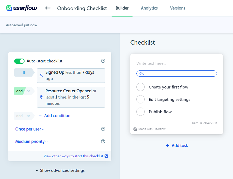 • Checklists: Userflows lets you create checklists with an unlimited number of tasks, trigger them if certain targeting conditions are met, configure whether tasks need to be completed in a specific order, and prevent users from dismissing the checklist if needed.
