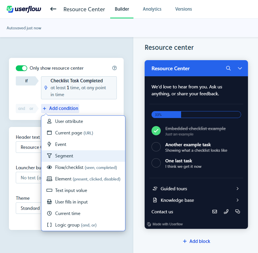 • Resource centers: Userflow in-app resource centers can include blocks like checklists, help articles, free-form content, checklists, announcements, and flow triggers. You can also style the resource center with custom themes or hide/show blocks when specific conditions are met.