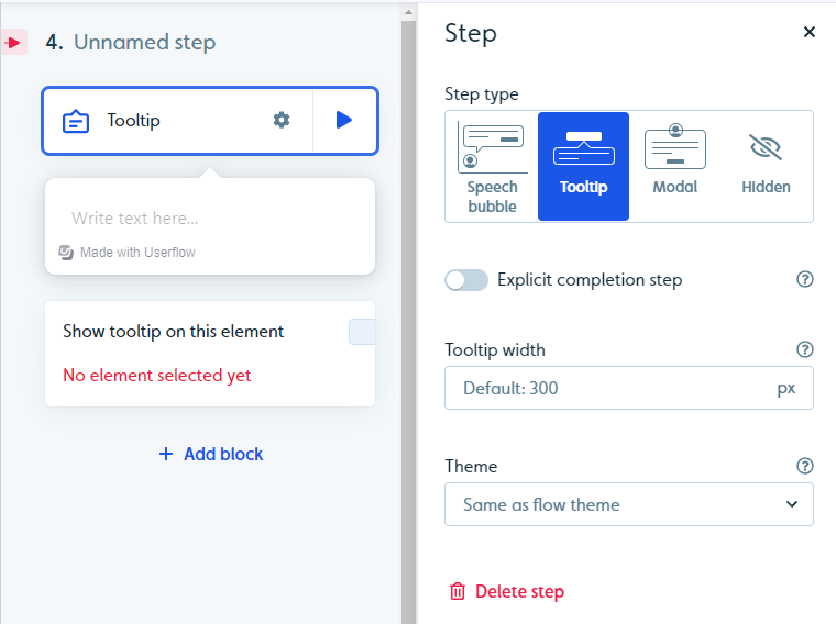 • Flows: In-app flows are the primary user onboarding feature that Userflow offers. You’ll be able to add steps like speech bubbles, tooltips, modals, or hidden steps used as triggers. You can also select whether a step is mandatory for flow completion and change the size or theme if needed.