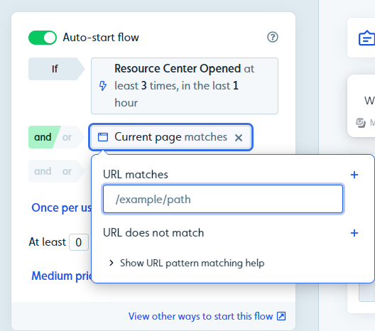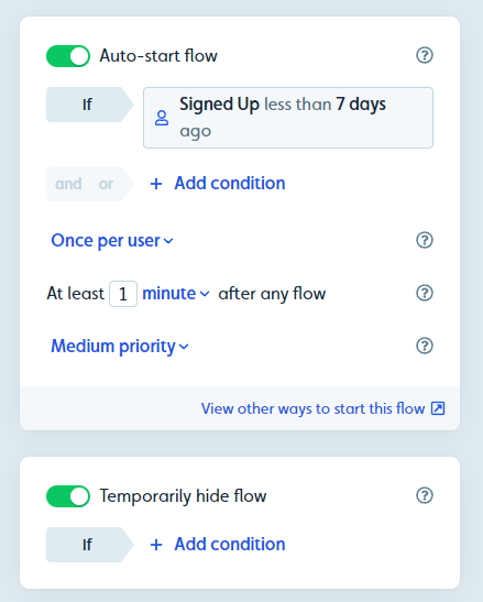 • Targeting: You can create personalized and contextual onboarding flows with Userflow due to its auto-start settings. You can add trigger conditions like what page users are on, which segment they’re in, when they signed up, which elements they’ve clicked, and which flows they’ve seen.