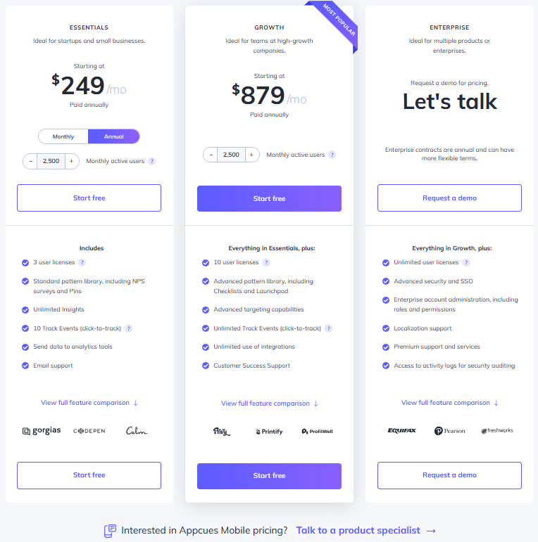 Pricing for Appcues starts at $249 per month, with the platform offering three distinct tiers – Essentials, Growth, and Enterprise.
