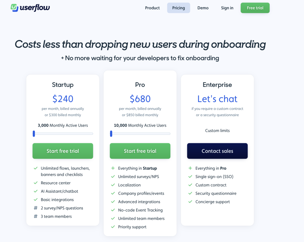 Userflow has three paid plans — Startup, Pro, and Enterprise — that start at $240 and increase in price as your MAUs grow. For example, the Startup plan costs over $1,000/month once you reach 50,000 MAUs which could make it difficult for products with thousands of freemium users to scale.