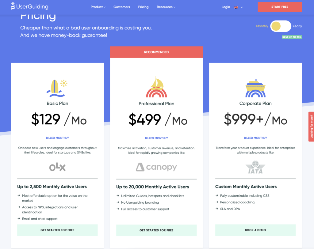 UserGuiding has three plans to choose from, targeted towards a range of business sizes from startup to enterprise.