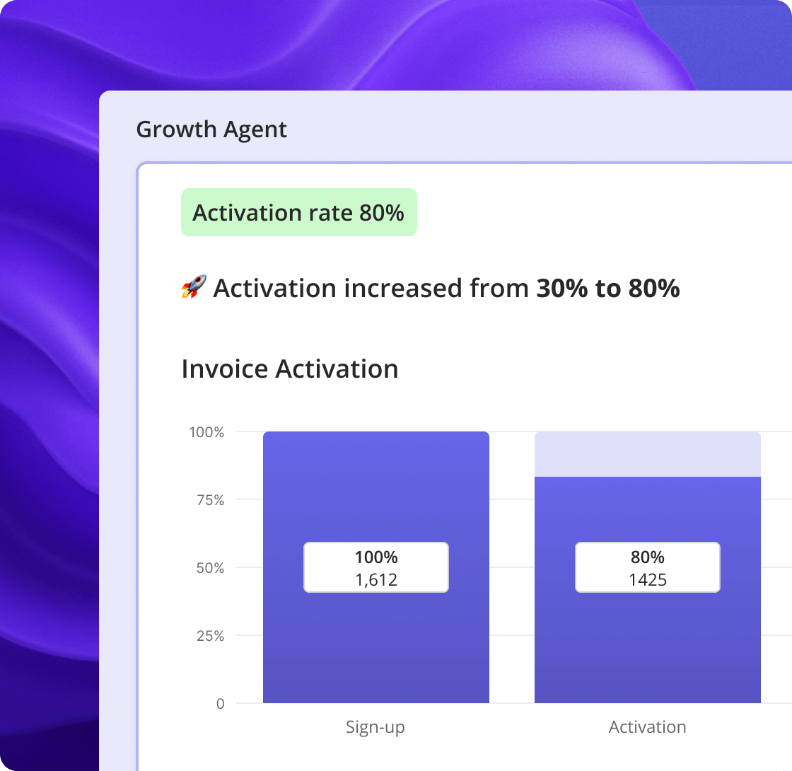 The Product Growth AI Agent analyzes product data and user insights (surveys, session replays), detects anomalies and drop-offs, clusters feedback, and explains the why behind friction.