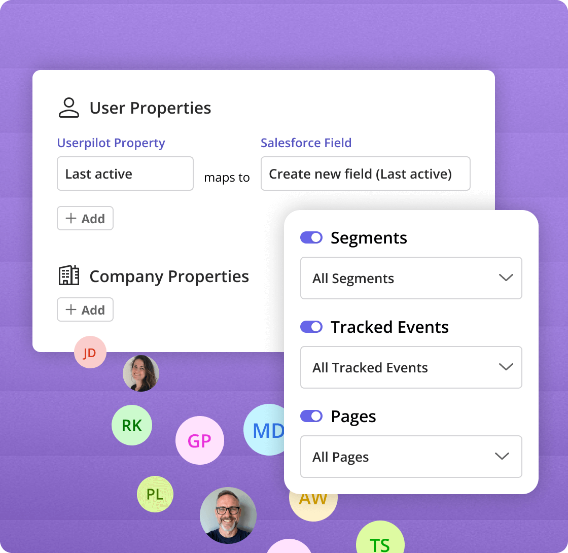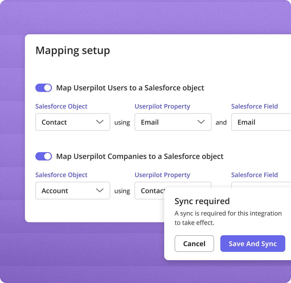 Map Userpilot users and companies to any object in Salesforce or Hubspot (standard or custom), to match your team's exact CRM setup.