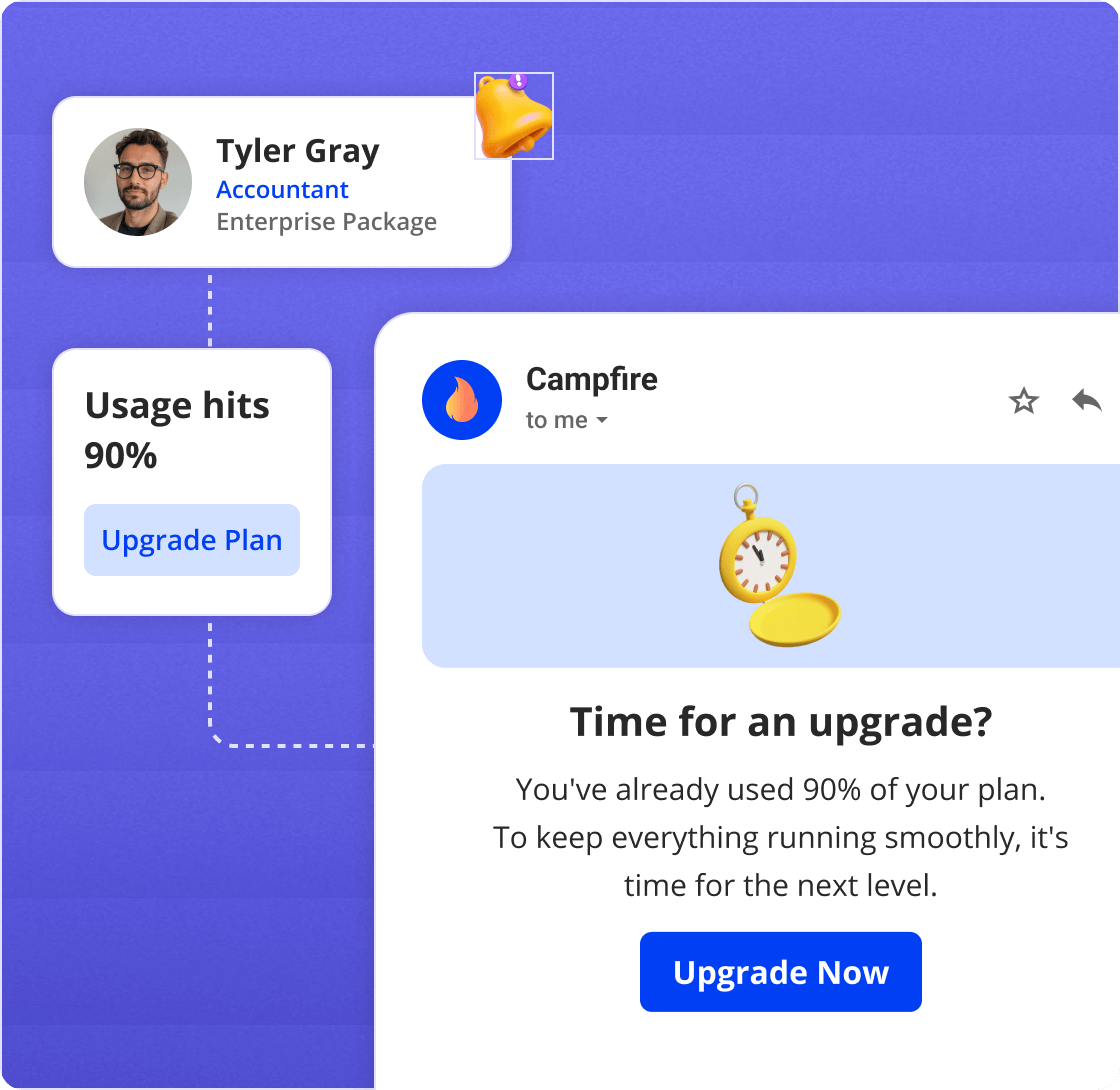 Send timely, personalized emails based on user actions. Welcome new sing ups, unblock stuck users, or push for upgrades.