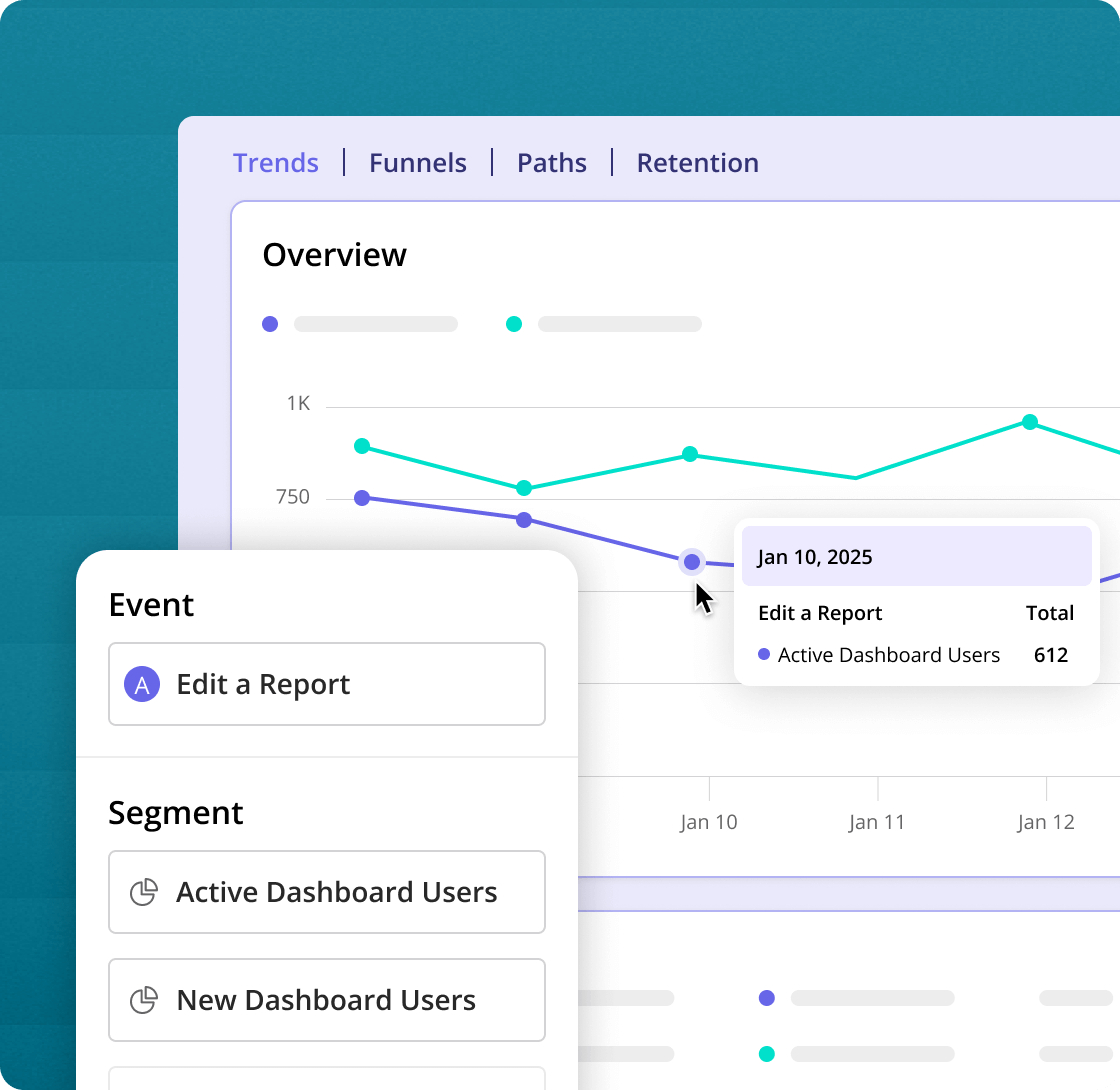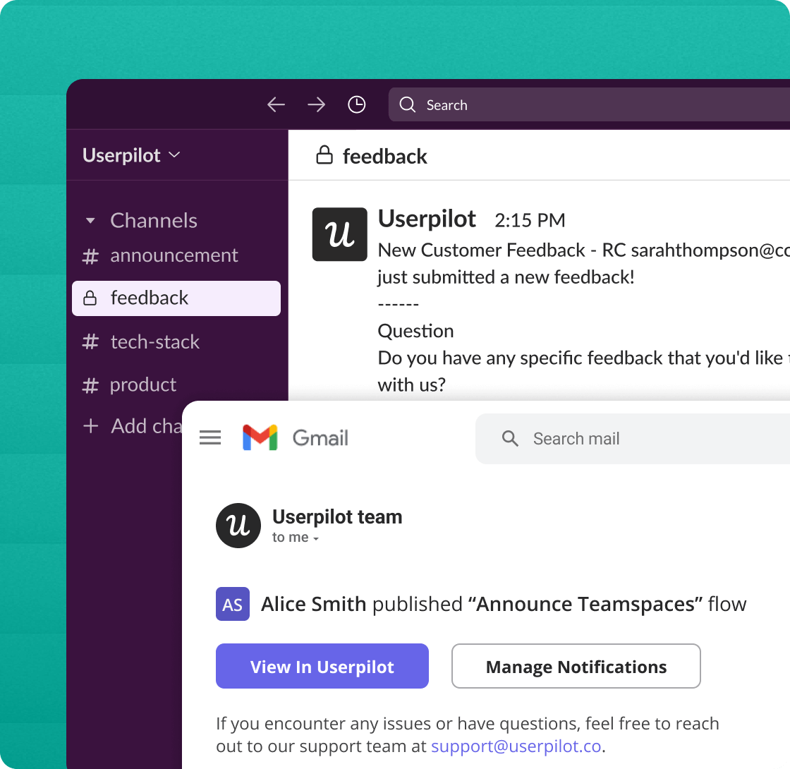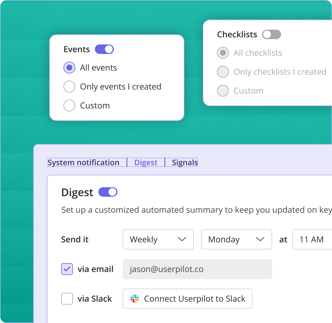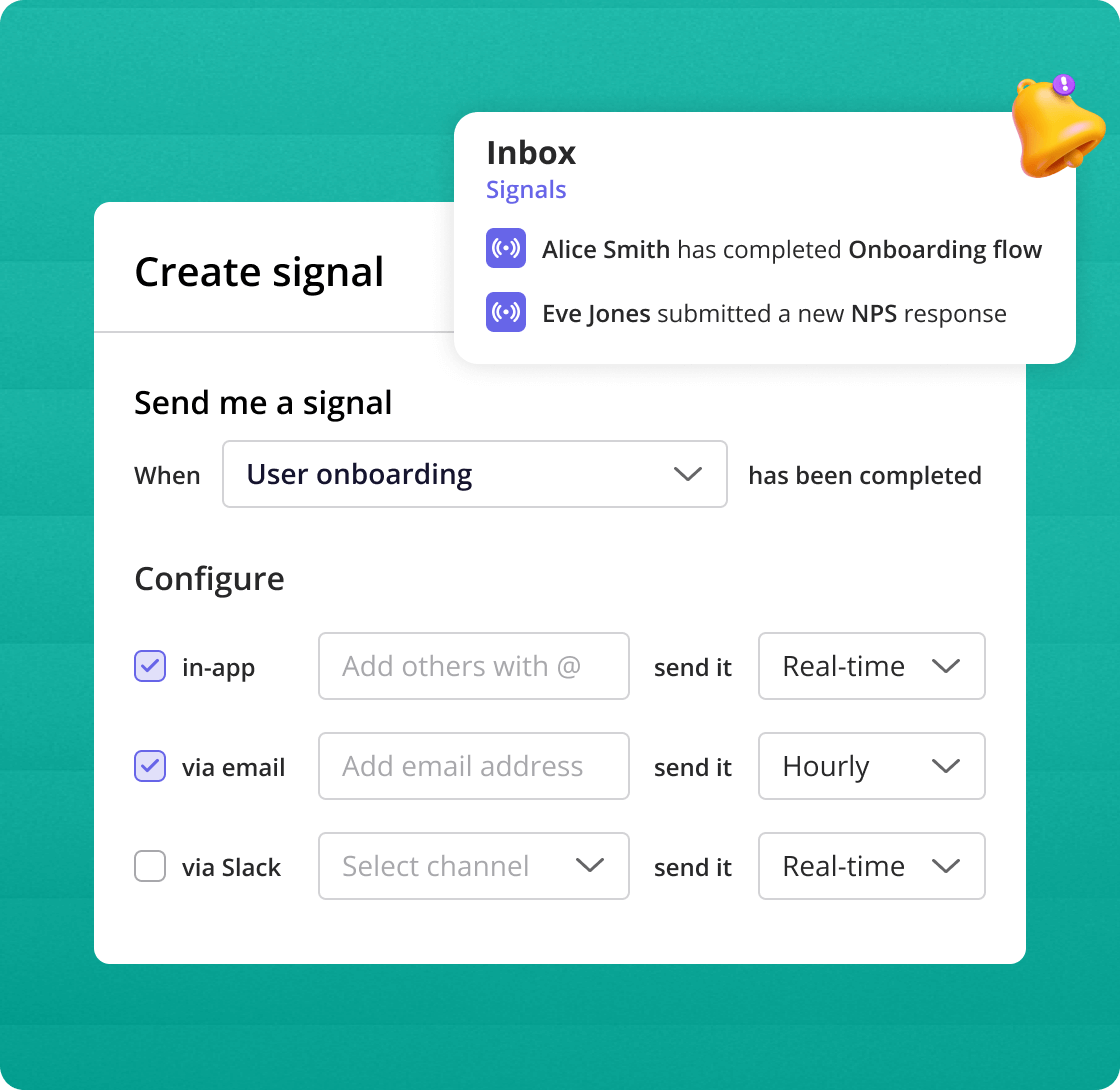 Set up your own custom alerts for any in-app event—like when a user completes onboarding checklist—to get real-time notifications on key milestones.