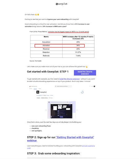 Once new users are in, they need to learn how to use your product effectively. I find it helpful to use emails for “big picture” instructions, like a weekly summary of progress or a guide to getting started with a core feature.