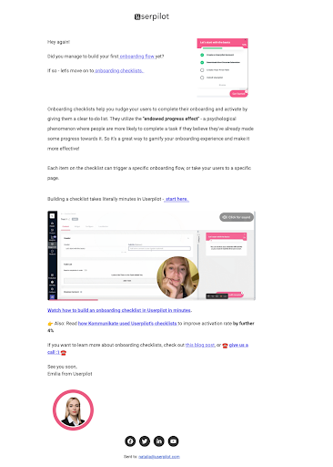 Onboarding is often the most critical stage. It sets the tone for a user’s entire relationship with your product. Our goal here is to get new users up to speed fast and keep them motivated as they learn. Tying your in-app messages to your onboarding emails reinforces both the information shared and the connection you build with new users.
