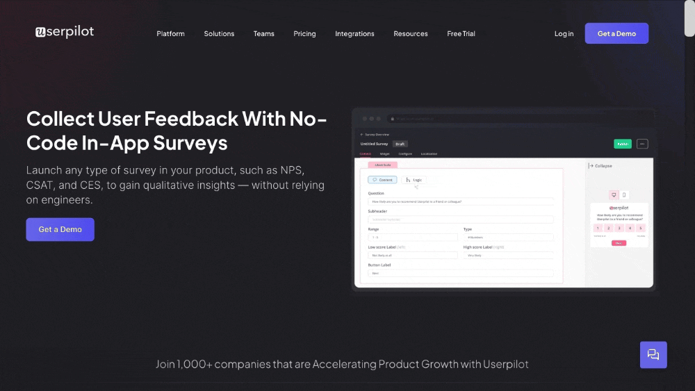 - Userpilot lets you target specific user segments and control when and how surveys are displayed.