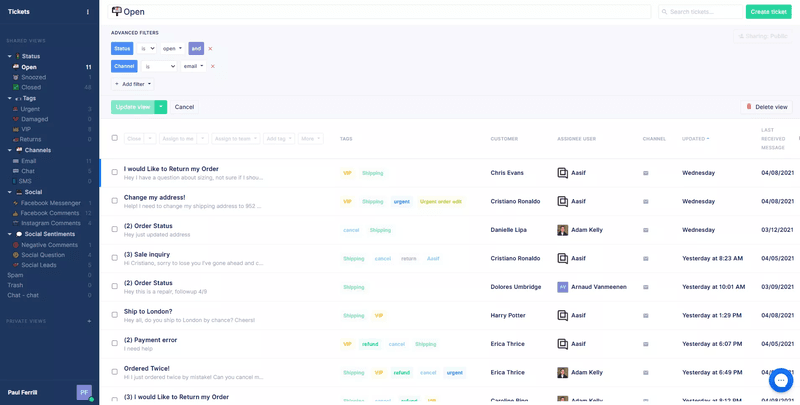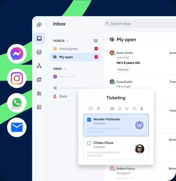 - Omnichannel support allows you to create tickets or answer messages from any channel through a shared inbox.