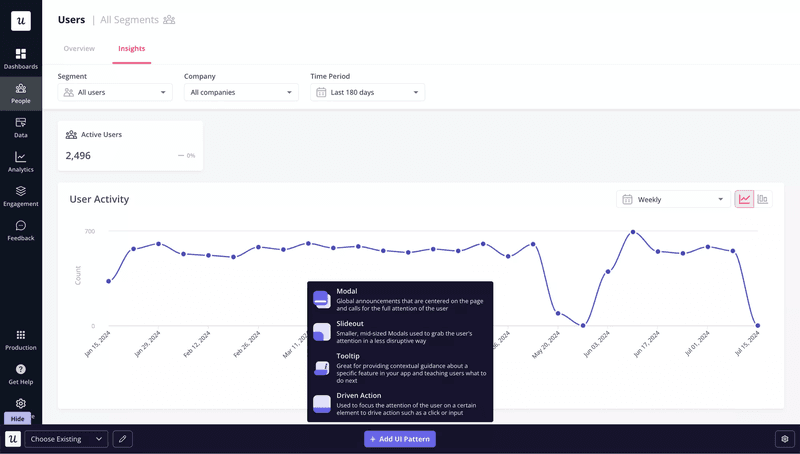- UI patterns to choose from such as tooltips, polls, modals, lightboxes, onboarding checklists, and banners.
