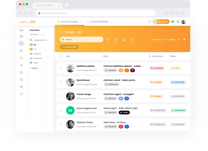 LiveAgent is a help desk software that captures all user messages and sends them into its ticketing system for easy management and resolution. This way, you can answer users fast, organize support team communication and tasks, and improve team performance (based on data).
