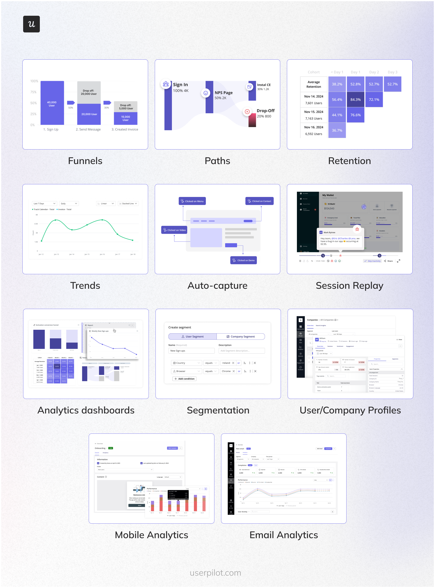 At Userpilot, we leverage product analytics to gain deep insights. We track everything from user activity patterns to product usage metrics, giving us a clear picture of how users interact with our platform. Our user engagement analytics help us pinpoint exactly where users might be struggling or where they find immense value. We use funnel analysis to visualize user journeys and identify drop-off points, so we know where to optimize. Tools like our custom analytics dashboards and session replay allow us to see what matters most to our business.