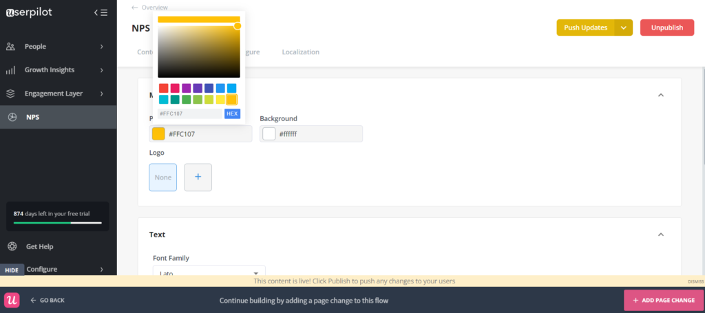 Luckily, there’s onboarding software like Userpilot which lets you build and edit onboarding flows in whatever color you please, code-free ;).