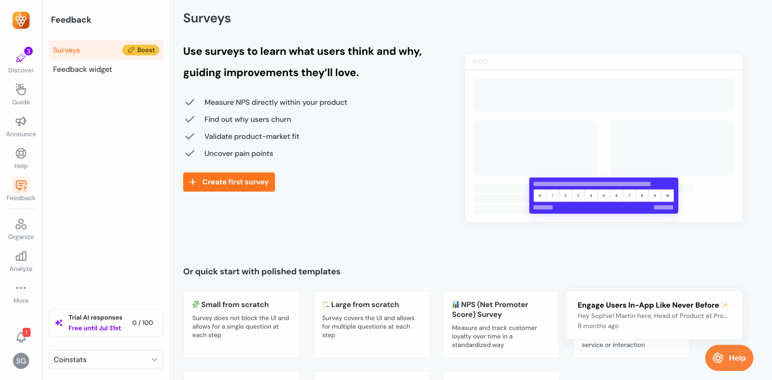 - Access a basic analytics dashboard to review response rates and user comments: However, the reporting is surface-level, as there’s no trend analysis, segmentation of feedback by cohort, or advanced visualization of sentiment over time.