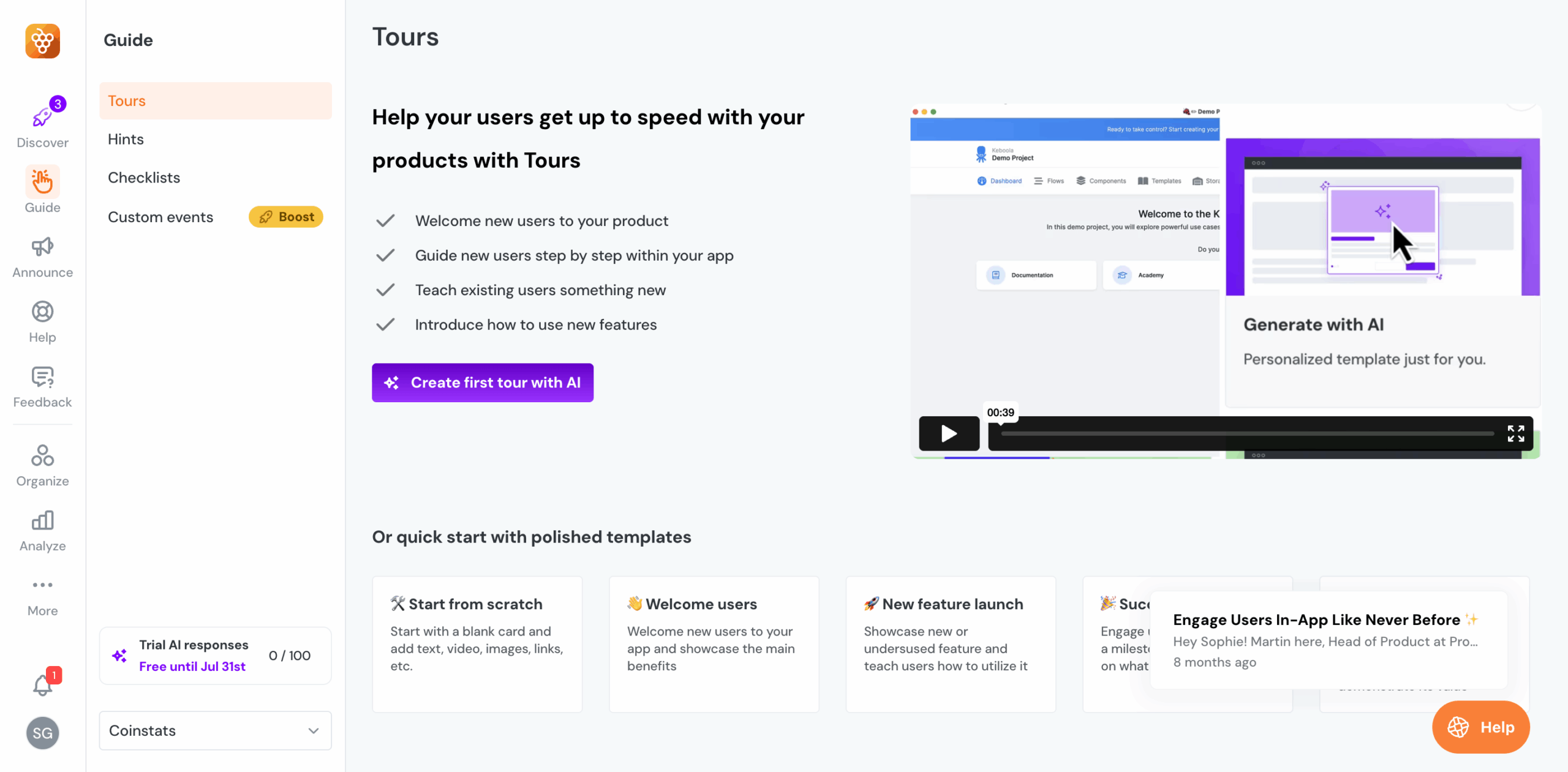 - Product tours: Great for guiding users step-by-step, but they’re mostly linear with no support for branching or personalization.