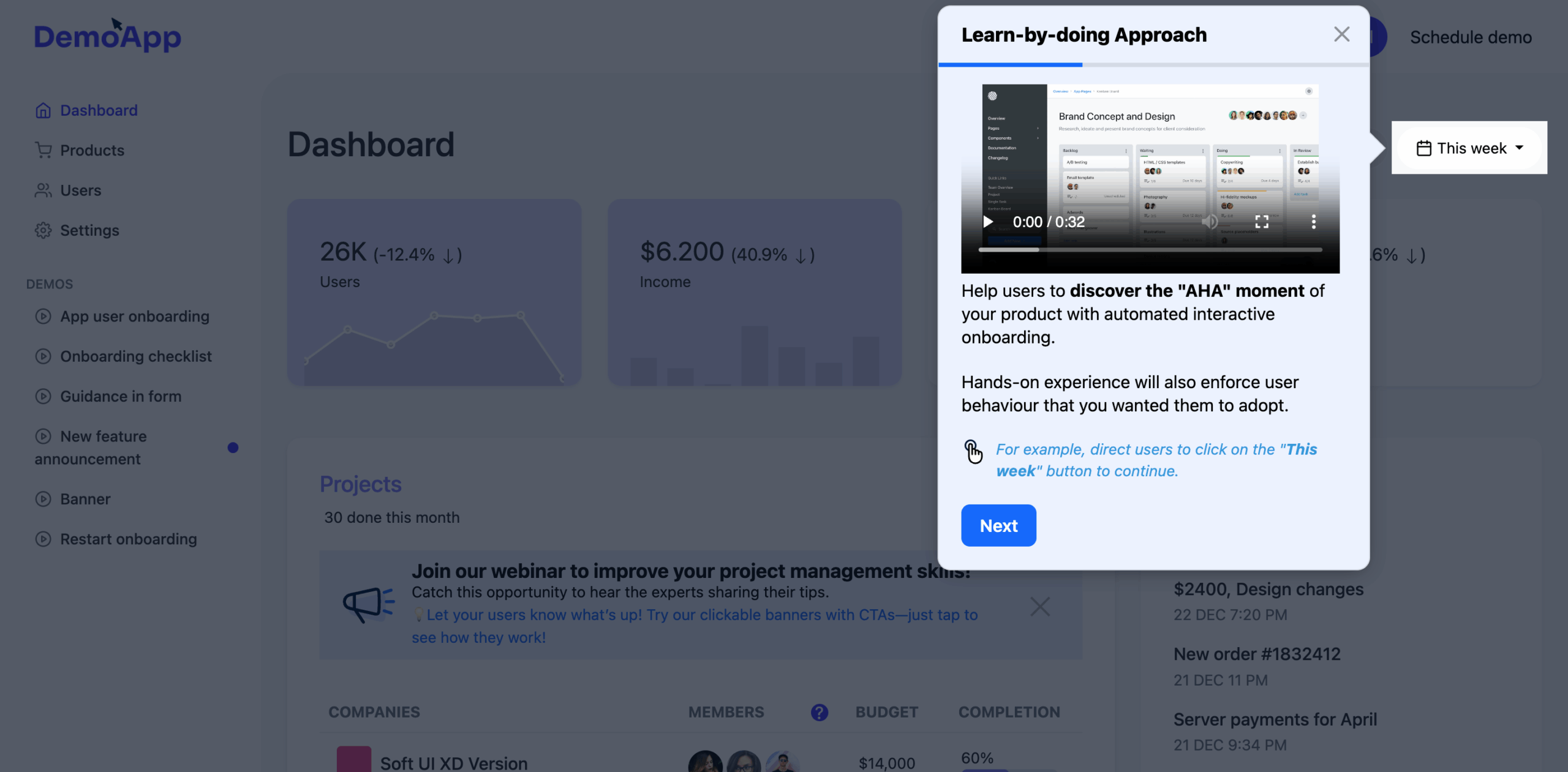 - Fully interactive walkthroughs that guide users through engaging with and adopting specific features inside your app.