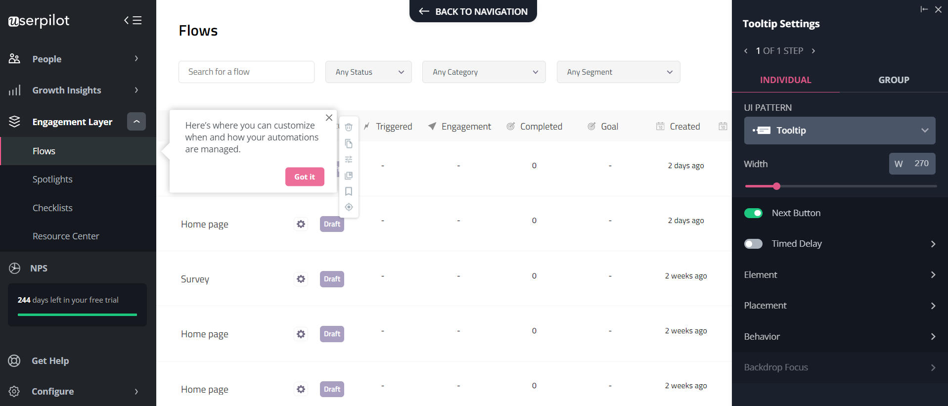 So, they implemented in-app checklists to drive users to adopt that feature – and then provided secondary onboarding through interactive walkthroughs to get customers to use other features as well.