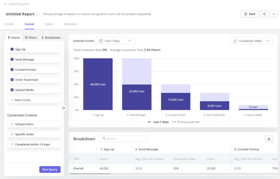 - Funnels: Funnel reports show you the number of users who enter a funnel versus the percentage who complete it. Using Userpilot’s funnel reports to track activation points and adoption goals can help identify the stages where users drop off so you can patch these leaks.