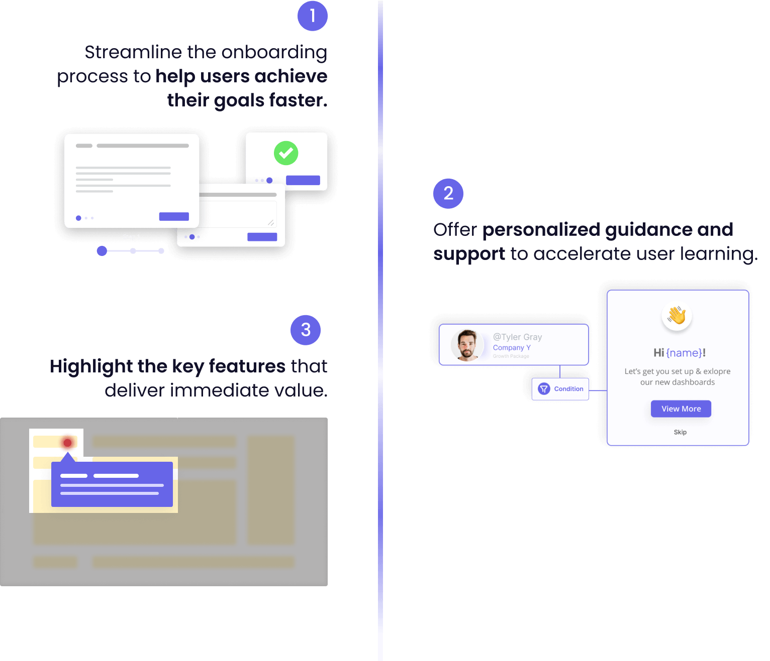 It makes it easier for users to find the next step and ensure that they don’t drop off before hitting their activation point.