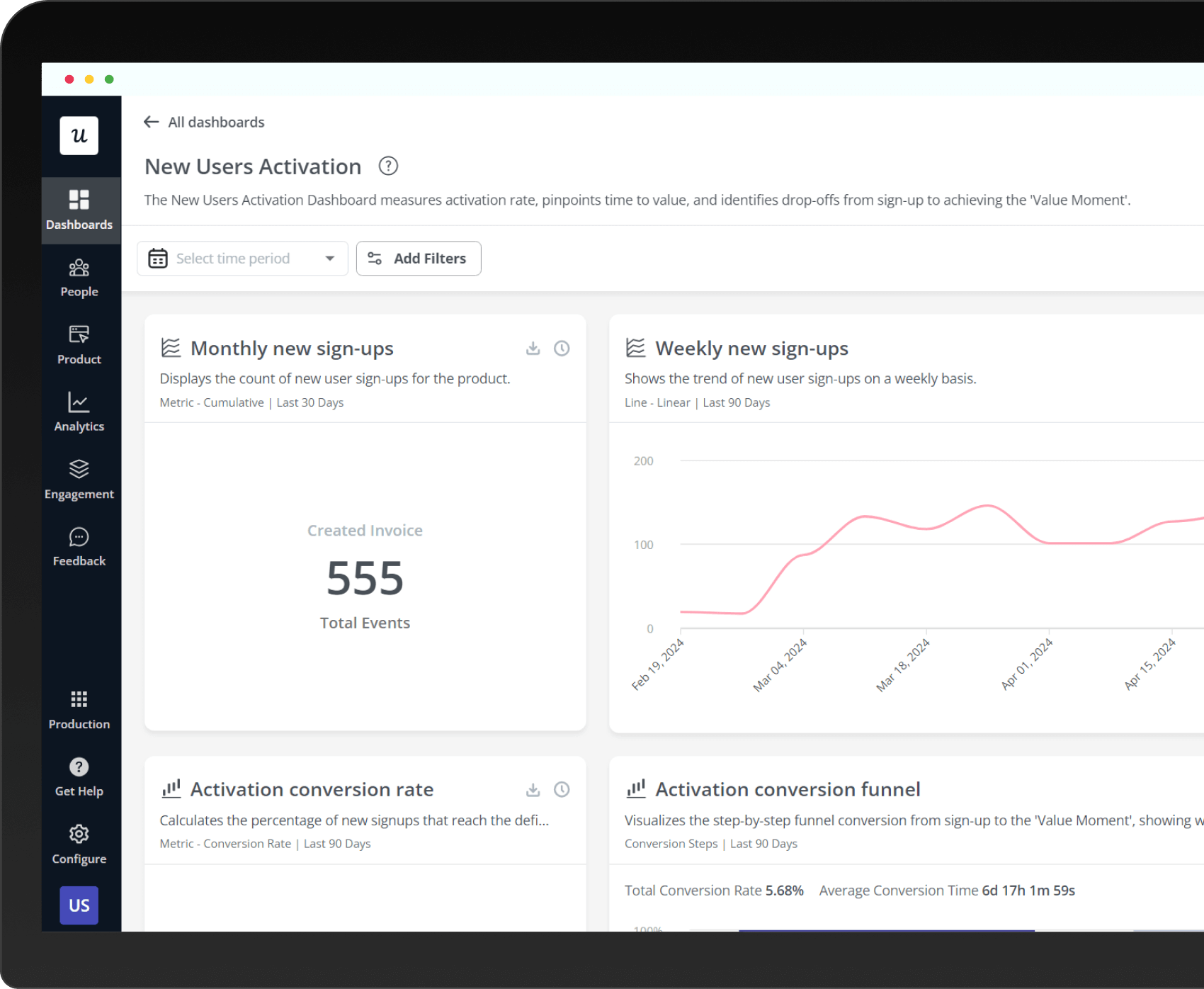 User activation dashboard with activation rate, time to activation, and activation conversion funnel done-for-you