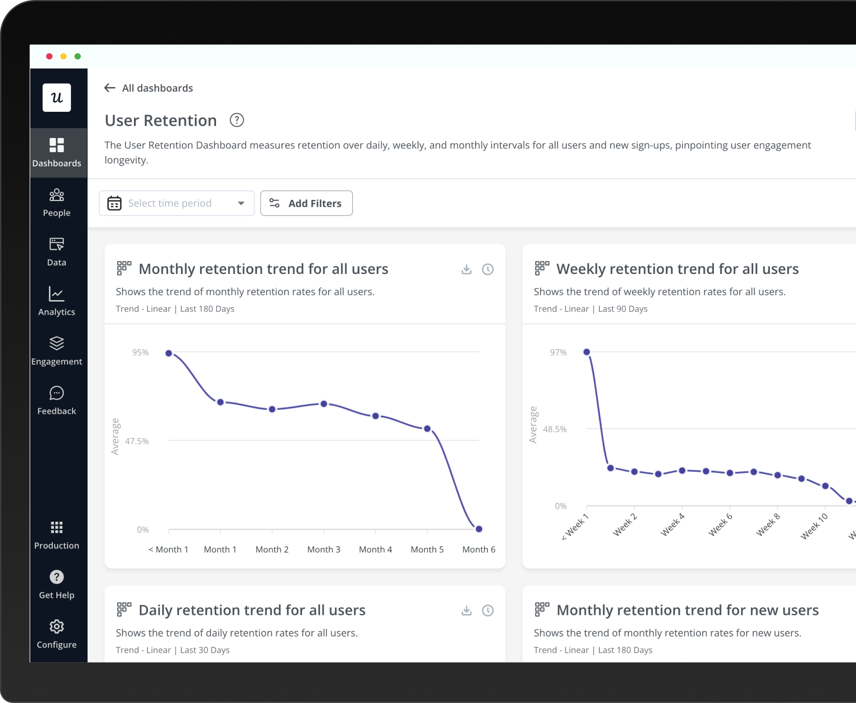 We analyzed 83 companies to determine the average Month 1 retention rate, using our User Retantion Dashboard for this purpose. This dashboard measures retention over daily, weekly, and monthly intervals for all users and new sign-ups.
