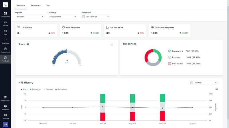 It’s an excellent tool for product teams who need to send in-app surveys (think of NPS, CES, CSAT, etc.) based on user actions, and measure customer sentiment without writing a line of code.