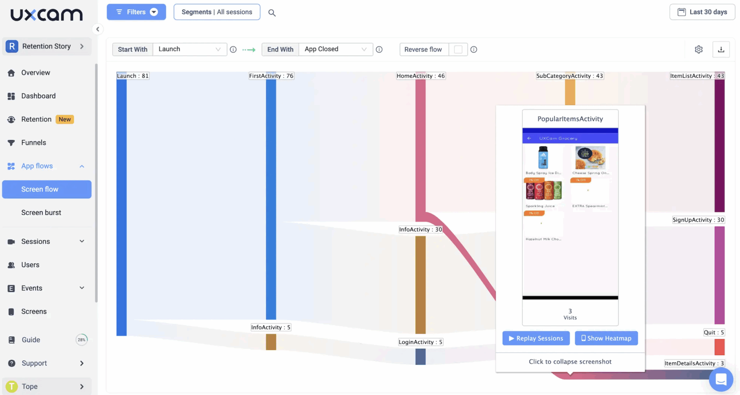 - Session replays and heatmaps: Watch real-time replays of user sessions and view mobile gesture heatmaps to directly observe usability challenges and improve the user experience.
