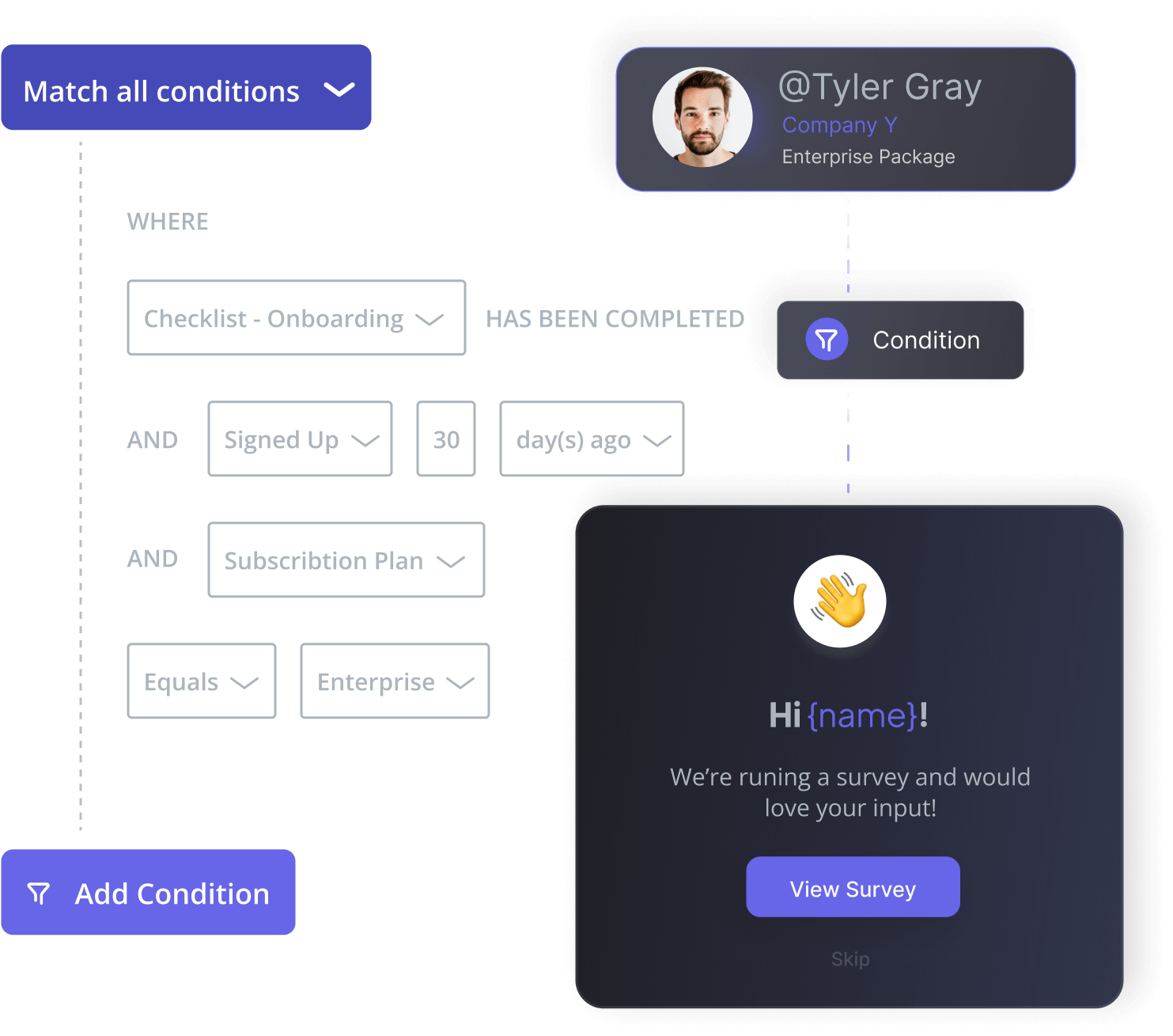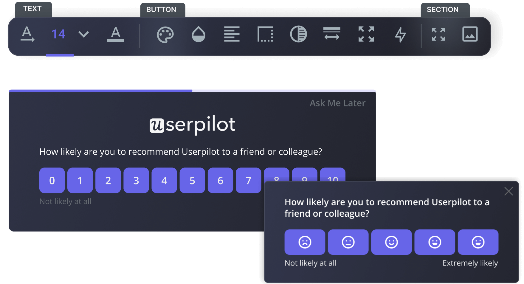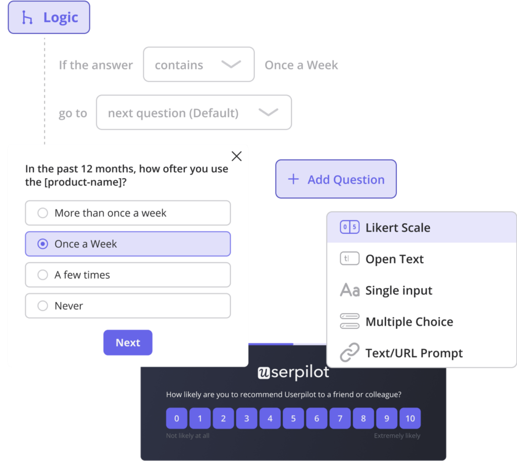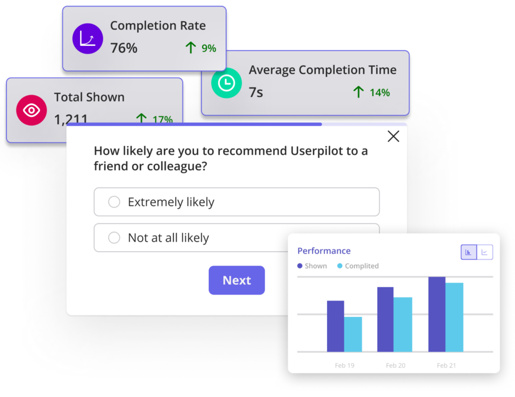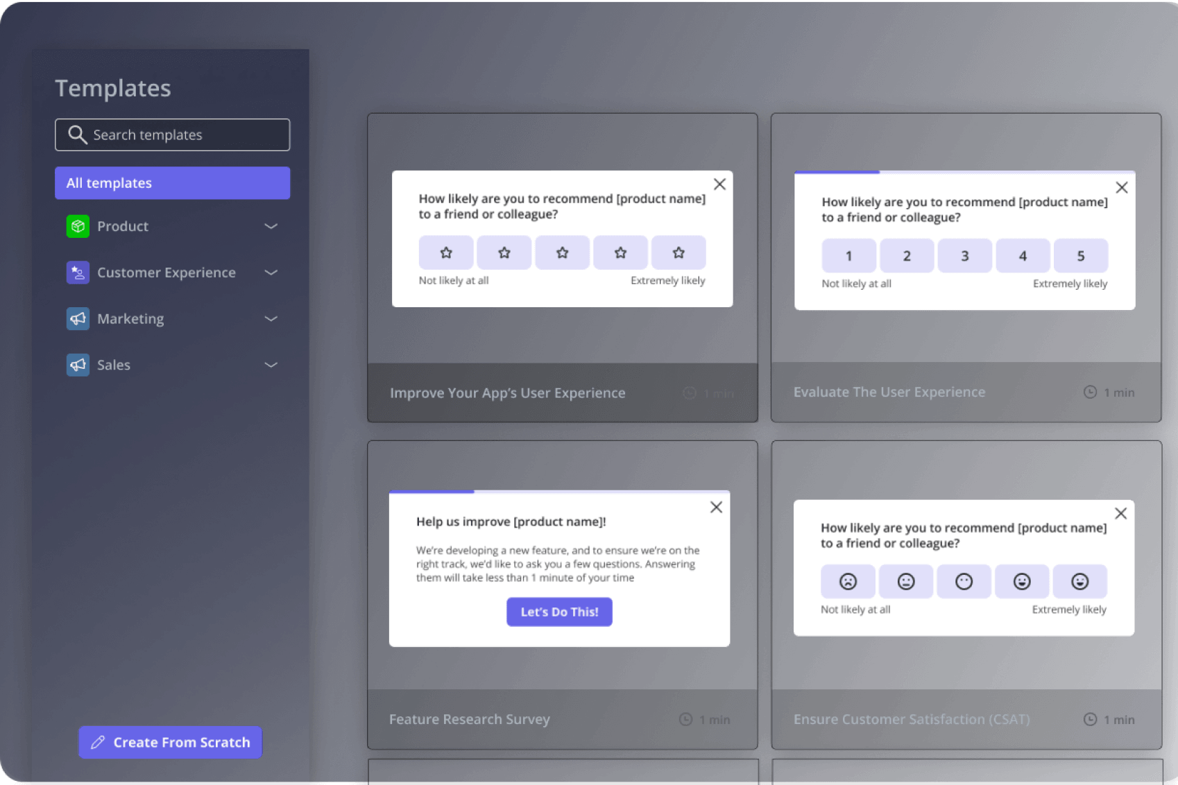 Launch any type of survey in your product, such as NPS, CSAT, and CES, to gain qualitative insights — without relying on engineers.